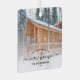 Commemorate your first Christmas in your new home with this beautiful modern keepsake ornament. The black text reads "First Christmas in our new home," with the words "new home" in elegant handwriting script with flourishes before and after. Replace the sample image with a photo of your new house and add your family's last name. A white gradient filter helps make the text pop.