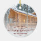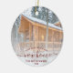 Commemorate your first Christmas in your new home with this beautiful modern keepsake ornament. The dark red text reads "First Christmas in our new home," with the words "new home" in elegant handwriting script with flourishes before and after. Replace the sample image with a photo of your new house and add your family's last name. A white gradient filter helps make the text pop.