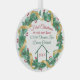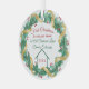 This beautiful custom new home Christmas ornament is personalised with your address and year in chic green and red typography within a festive holly berry wreath with gold garland wrapping around the greenery. Contemporary holiday present and housewarming gift. First Christmas in Our New Home.