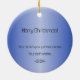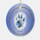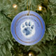 Our First Christmas In Our New Home with paw print on a blue background Ceramic Ornament. Check out the back to see where you can add your own personal comments.
