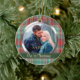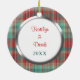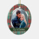This holiday keepsake ornament features your own photograph within a Christmas red and green plaid pattern frame which has an inside silver lining. A green banner holds your customised text; make it say whatever you'd like! The other side has the same plaid border with additional text on the white interior. An elegant and festive keepsake gift for newlyweds or any couple.