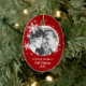 Personalised Christmas ornament with modern design featuring winter white snowflakes on red and round photo. A beautiful keepsake for your first Christmas together!