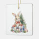 Whimsical illustration of a cute bunny with gifts and a tree printed on a ceramic ornament commemorating baby's first Christmas. Text on back can be changed. AI assisted graphic purchased with commercial use. Artwork: DelightfulDigiArt