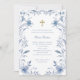 These elegant French toile style First Holy Communion invitations feature a beautiful chinoiserie frame of blue watercolor flowers and botanical leaves, along with modern calligraphy and classic text on a simple white background. The flowers are a mix of dusty blue and navy blue, and there is a faux gold cross.