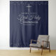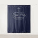 First holy communion photo booth backdrop featuring delicate silver stardust confetti, you can personalise with your special information in chic silver text on a navy blue background. Designed by Thisisnotme©