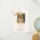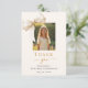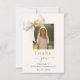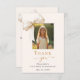 A modern and elegant First Communion thank you card for a girl. A soft cream coloured background, decorated with a large bow. Black and golden letters. On the front the text: Thank You, photo, name, and a date.