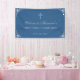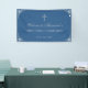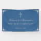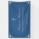 The background is classic blue. There is a faux silver foil vintage frame and (faux) silver cross above the text. The message "Welcome to [Name]'s" is written in an elegant calligraphic script, the rest in caps. All text is grey.