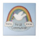 Ceramic tile to commemorate a First Holy Communion. Design features white dove with olive branch with rainbow and clouds. Personalise with name and date. Makes a beautiful keepsake for a First Holy Communion.