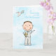 A First Holy Communion congratulations card for a boy has a cute little boy with short brown hair holding a gold cross. The background is blue and white with a watercolor look. There is a white dove with branch at the top. Graphics ©Scrappin Doodles.