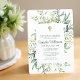 Composed of serif typography. All against a backdrop of white background with green leafy leaf foliage with faux gold cross. The back of the card has a wooden panel design.