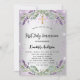 A modern, stylish and glamourous invitation for a First Holy Communion. A faux silver looking background with violet faux glitter, sparkles, lavender florals, flowers and eucalyptus greenery. The name is written with a modern hand lettered style script. Personalise and add your details.