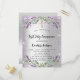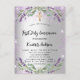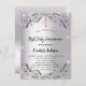 A modern, stylish and glamourous invitation for a First Holy Communion. A faux silver looking background with violet faux glitter, sparkles, lavender florals, flowers and eucalyptus greenery. The name is written with a modern hand lettered style script. Personalise and add your details.