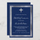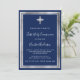 A modern, elegant and invitation. A navy blue background decorated with a cross, faux silver frames. Personalise and add a name and details. White text.