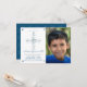 This First Holy Communion photo invitation card features a grey chalice and wafer (holy communion) surrounded by an ornate cross and the words "First Communion" written in an elegant font. Ideal for your boy's special religious occasion, the text, picture, and background colour (on the back) can be customised to your liking.