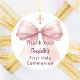 A white background. Decorated with a large pink bow and a golden cross. Personalize and add the name. Text: Thank you!