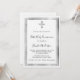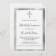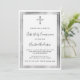 A modern, elegant and invitation. A white background decorated with a cross, faux silver frames. Personalise and add a name and details. Black text.