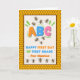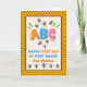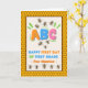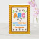 Custom front, add a name, Happy First Day of First Grade, paper greeting card with bees and honey comb. The bees are gathering around the letter B on the cover. Cute Bee verse inside. Change or add to the text on the cover and inside as desired. Art, image, and verse © Shoaff Ballanger Studios, 2024.