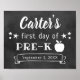 Simply stylish first day of pre-k school sign for kids features custom text for the students name, first or last day of, grade level, and banner date - accented by stars. Includes white text on a contrasting black background with a rustic chalkboard appearance. Just add a frame. This simple easy to read poster sign looks great held by your child in their back to school photos.