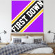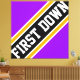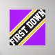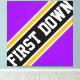 This sporty football design features athletic FIRST DOWN text inside highlighted wide diagonal black, white, and golden yellow racing stripes against bright purple background. The first and last letters of the text run off the design edges with a dynamic banner effect. The colours and text in this design can be personalised.