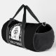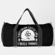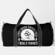 This black duffle bag is perfect for any woodworker or builder whose day starts with coffee! It features a design with coffee beans and a bag of coffee within a circular saw blade, stating "FIRST I DRINK COFFEE THEN I BUILD THINGS." It's an ideal gift for carpenters, DIYers, and anyone fuelled by their morning brew and passion for creation. Edit colour of the bag caps and body in the Design tool to your favored colours.