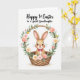 This card shows a sweet rabbit-like character with soft light-brown fur sitting snugly in a woven wicker basket, its long ears tipped with pale pink and its cheeks lightly rosy 🐰. A small fuchsia bow tie at its neck adds a dressy touch, and its wide dark eyes and tiny whiskers give it a tender, friendly look. Around the basket, a circular garland of spring flowers and leafy greens frames the scene like a gentle hug, suggesting closeness and care. Pastel pink roses, white daisies with yellow centers, and small yellow and pink blossoms are tucked between curved green leaves, all set against a plain white background. The lighting stays soft and even, keeping the colors calm and easy on the eyes. Centered above the illustration, the message “Happy 1st Easter to a special Granddaughter” appears in neat black lettering. A small 🌷 can be added near the text to echo the floral ring. The basket’s woven texture is detailed with light tan strands and subtle shading beneath the bunny.