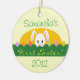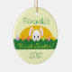 An adorable First Easter peeking bunny double sided ceramic ornament. Ornament is round and features a cute bunny in a spring garden with Easter eggs on a light yellow ceramic background. The ornament reads "First Easter" in a lovely green lettering, with template areas for you to personalise it with your child's name and year. To alter the font colour, style, or size simply click on 'customise' and those options will also be available to you. A special keepsake ornament to add to your Easter holiday tree or holiday decor, and is a great holiday gift for friends and family too! This peeking bunny design is available on cards and other gift items too. Please visit our shop for more Easter, and spring greeting cards, stamps, gifts and more!