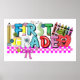 This bright and cheerful design celebrates the excitement of first grade with bold multicolored letters spelling “FIRST GRADE,” each decked out in playful patterns like florals, polka dots, and stripes. Surrounding the typography are classic school icons—pencils, crayons, a smiling apple, and a soaring paper aeroplane—that add a sense of movement and joy. A pink chequered base with a bow and floral accents softens the composition, enhancing its whimsical, welcoming feel. Perfect for customisable classroom decor or materials that highlight the joyful adventure of early education.