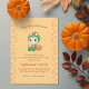Adorable baby dressed in a green dragon costume with orange spikes and matching orange bib with a skull. A curved pumpkin stands just a little behind. First Halloween party invitation for baby of any gender.