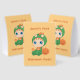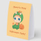 Adorable baby dressed in a green dragon costume with orange spikes and matching orange bib with a skull. A curved pumpkin stands just a little behind. Baby’s first Halloween party invitation, any gender.