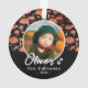 First Halloween Orange Mushroom Fall Photo Ornament. Lovely orange and black mushroom pattern in fall colours, a custom baby's name in a trendy script. Personalise the ornament with your baby's photo, name and year. A lovely Halloween holiday keepsake.