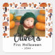 First Halloween Orange Mushroom Fall Photo Sticker. A lovely orange and black mushroom pattern in fall colours, a custom baby's name in a trendy script. Personalise the sticker with your baby's photo, name and year. A lovely Halloween holiday keepsake.