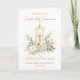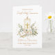 This design features a watercolor illustration of a Candle with a Cross and Bible, surrounding by green leaves and whitish flowers.