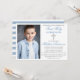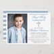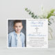 Modern Elegant Dusty Blue and Silver First Holy Communion Invitation with Cross and Photo. Blue and White Stripes on Back.