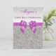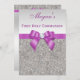 Elegant custom silver First Holy Communion invitations for girls with a beautiful glittery silver printed image sequins jewels, gems pattern, cute, sophisticated shiny radiant orchid / purple / lilac / lavender / mauve printed bows and ribbons images and pretty digital image diamonds bling jewels and purple text on a silver gradient background. Please note: All invites on Zazzle have flat printed images. These classy, fancy, glamourous, girly 1st Communion invites are decorated both sides. Beautiful, stylish, chic, trendy, modern, glitz and glamour invitations. Text, font and colour of font can all be customised. If you need assistance customising your product please contact me through my store. I will be happy to help.