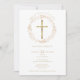 Elegant gold cross floral garland First Holy Communion invitation The name of the special one is framed in a delicate faux gold foil floral garland and cross. Below the special First Holy Communion details are set in chic typography. The reverse features your special photo. Designed by Thisisnotme©