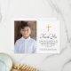 Elegant First Holy Communion thank you card with photo template and your custom thank you message. Faux golden look cross (printed colour gradient, NOT real foil) on a white or custom colour background. You can change all colours in the design tool.