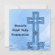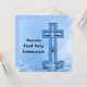 Cute and unique design with blue colours, shown says: "Daniel's First Holy Communion" on the front with an original art design of a special cross with star burst all reflected in the peaceful water ripples below. Easily change the name and add your custom text on the back. Remember this special holy day with these custom invites and announcements for your family and friends. See similar First Communion stickers and buttons, pins, magnets, t-shirts, postage stamps, and binders at MVDesigns store. Also great for confirmations, baptisms, and weddings!