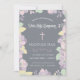 This elegant and pretty first holy communion invitation features an abstract pink, purple and green floral border and a cross. Perfect for a girl's special religious occasion, this invite can be customised for your child's event or party by changing the background colour and text to your liking.