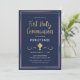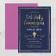 This modern and classy First Holy Communion invitation features an illustrated gold chalice, a blue, pink, purple, and gold border, and the words "First Holy Communion" in gold. The background is a navy blue colour, but can be customised to any colour you choose. The text is customisable for your special religious sacrament.