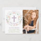 This modern and trendy First Holy Communion photo invitation card features an illustrated wreath of flowers encircling a cross with the words "first communion" in an elegant script font. The right side of the invite features a photo area. The text and photo can be customised to your liking.