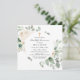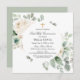 Modern botanical design features ivory white roses nestled in sage green eucalyptus leaves. Your First Communion celebration details are placed in the center on a white circle.