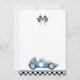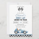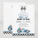 This fun 1st birthday party invitation features a vintage blue race car and chequered flags. Designed by Thisisnotme©