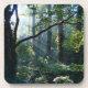 Brilliant white rays of the morning sun streaming from behind dark branches into a rich green summer forest, with massive ivy-covered trees and fertile underbrush.