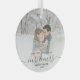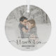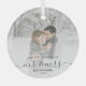 Commemorate the first Christmas of your marriage with this beautiful modern keepsake ornament. The charcoal gray text reads "Our first Christmas as Mr & Mrs," with the words "Mr & Mrs" in elegant handwriting script with flourishes before and after. Replace the sample image with your favorite photo, and add your last name and the year. A white gradient filter helps make the text pop.