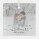 Commemorate the first Christmas of your marriage with this beautiful modern keepsake ornament. The charcoal grey text reads "Our first Christmas as Mr & Mrs," with the words "Mr & Mrs" in elegant handwriting script with flourishes before and after. Replace the sample image with your favourite photo, and add your last name and the year. A white gradient filter helps make the text pop.