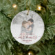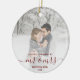 Commemorate the first Christmas of your marriage with this beautiful modern keepsake ornament. The dark red text reads "Our first Christmas as Mr & Mrs," with the words "Mr & Mrs" in elegant handwriting script with flourishes before and after. Replace the sample image with your favorite photo, and add your last name and the year. A white gradient filter helps make the text pop.