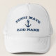 First Mate hat with nautical anchor and custom name. Vintage typography template for sailor's companion. Make your own personalised hat for sailing and boating trips. Navy blue ship anchor symbol with grungy text. Cute Birthday gift idea for partner. Make your own for girlfriend, deck crew, team, yacht owner, mum, aunt, mother, sister, brother, wife, son, daughter, kids, assistant, co worker, captain's assistant, ship spotter etc. White or custom cap colour.