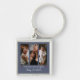 Personalise a memorable keepsake for a new mum with this Blue First Mother's Day Three Photo Collage Keychain. Keychain design features three photo placements in panel form with modern typography and elegant script and two red hearts. Perfect photo keepsake for mum's celebrating their first Mother's Day.