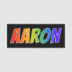 This fun, vibrant, multicolored name tag design features the common first name "AARON", with the letters of the name having a colourful rainbow spectrum like gradient colouring pattern, on a black coloured background. A nametag like this might be worn by an employee, a staff member, or a volunteer whose first name is Aaron, to help identify the wearer to others. [~Z0000344]