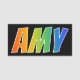 This fun, vibrant, multicolored name tag design features the common first name "AMY", with the letters of the name having a colourful rainbow spectrum like gradient colouring pattern, on a black coloured background. A nametag like this might be worn by a staff member, a customer service representative, or an employee who is named Amy, to help identify the wearer to others. [~Z0000344]